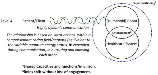 Figures 1, 5, and 9 present the scientific progression in the complexity and sophistication of human–robot interaction (HRI) within healthcare systems. Figure 1 depicts Tanioka’s model [10], which is grounded in cybernetic communication theory and establishes fundamental feedback loops between the patient, humanoid robot, and healthcare system, featuring a bidirectional flow of information. Figure 5 advances this framework by introducing the Level 4 HRI model, which includes “dynamic communication”, the ability to adjust in real time to a changing environment, and “entanglement”, the joint attunement in sensing, knowing, and feeling the presence of others, along with metacognitive reflection on one’s thought processes. The model also includes “superpositioning”, which refers to the tendency to exhibit agency in thinking and acting. These concepts suggest a more integrated and flexible interaction paradigm, drawing on quantum mechanics to describe relational dynamics and indicating a shift towards more adaptive and responsive robot systems.