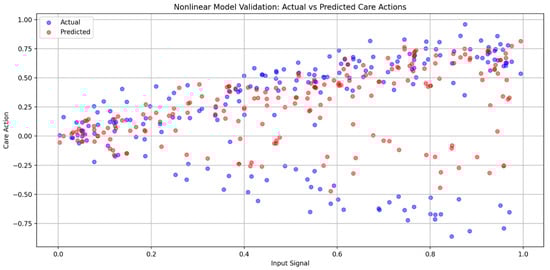 Figures 2–4 simulate the information flow among the healthcare system, robot, and patient, utilizing Matplotlib for visualization. The “validate model” function ensured simulation integrity by checking state ranges, correlations, trends, and variability, as shown in Figure 3, while sonification was used to map state values to audio frequencies in Figure 4. Figures 6–8 and 10 introduce quantum concepts such as “entanglement” and “superposition” to simulate the caring process, covering sensor input, robotic perception, cognition, “intentionality” (the intents), action, and learning, with features such as “wave function collapse”. Figure 11 undergoes machine learning validation by training a random forest regressor on simulation data and then validating it using the mean squared error (MSE), R2, and cross-validation, along with a feature importance analysis. Figure 12 shows a sonification of the data points.