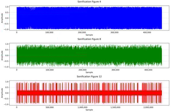 Figure 13 uses Pydub, Numpy, and Matplotlib.pyplot to analyze sonification audio files. Audio files are loaded with “AudioSegment.from mp3” and converted to Numpy arrays using “get array of samples”, and then normalized. Waveforms are visualized with “plt.plot” in separate subplots for comparison. The Numpy functions “np.mean” and “np.std” calculate the mean and standard deviation, quantifying central tendency and variability. This combines visual and statistical analyses to understand trends and differences in the sonification data.