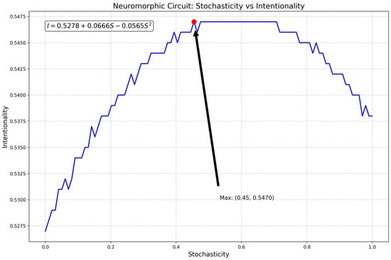 Figure 14. The mathematical model simulation of “stochasticity” and “intentionality” in the humanoid robot. Note: The blue line represents the relationship between “stochasticity” and “intentionality” in a neuromorphic circuit, as modeled by the equation I = 0.5278 + 0.0666S − 0.0565S2.) The pattern exhibits three distinct phases: Initial Rise (0.0 to ~0.45); Peak Plateau (~0.45 to ~0.8); and Final Decline (~0.8 to 1.0).