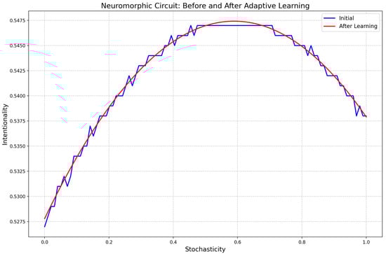 Figure 15. The mathematical model simulation of adaptive learning in the humanoid robot. Note: The blue line (“Initial”) shows the robot’s behavior before learning, characterized by jagged fluctuations due to varying levels of randomness (stochasticity). In contrast, the red line (“After Learning”) presents a smoother curve with less variability, indicating enhanced stability after learning. Both lines begin at around 0.5275 intentionality, peak at approximately 0.5475 at “medium stochasticity” (0.6), where there is a balanced mix of predictability and unpredictability, and then decline as stochasticity approaches 1.0. The main difference is that the red line represents a more optimized response, showing that adaptive learning has resulted in more controlled and predictable behavior while maintaining the relationship between “stochasticity” and “intentionality”.