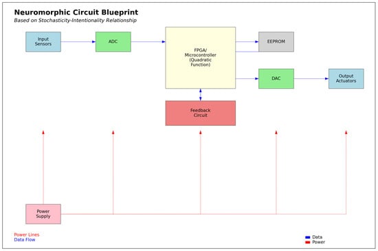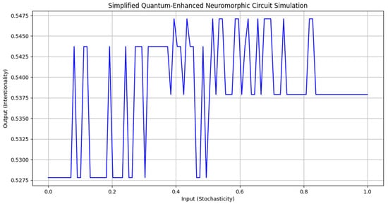 The computer circuit simulations (Figures 18 and 19) utilized Numpy, Matplotlib.pyplot, and Random libraries, involving two classes: “NeuromorphicCircuit” and “QuantumEnhancedNeuromorphicCircuit”. These classes process stochasticity values (0 to 1) representing caregiving scenarios. The circuits are initialized with coefficients a, b, and c to compute intentionality using the quadratic function (ax2 + bx + c). “NeuromorphicCircuit” handles basic decision making, while “QuantumEnhancedNeuromorphicCircuit” adds quantum-inspired components, including a quantum analog-to-digital converter. Both circuits adaptively learn by adjusting coefficients based on stored input–output pairs. The simulation generates 100–1000 data points to evaluate and compare the output intentionality of classical and quantum-enhanced circuits against input stochasticity.