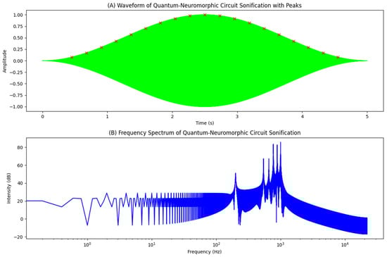 Figure 19. The data sonification of the quantum-neuromorphic circuit simulation. Note: The ‘x’ symbols in (A) mark the peak amplitudes of the quantum-neuromorphic circuit’s waveform, indicating moments of maximum oscillation in the system’s behavior. (Download the file at https://github.com/jphernandezrn/Data-Sonification-Human-Robot-Interaction).