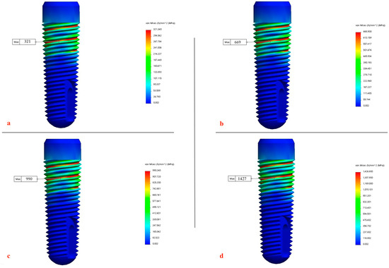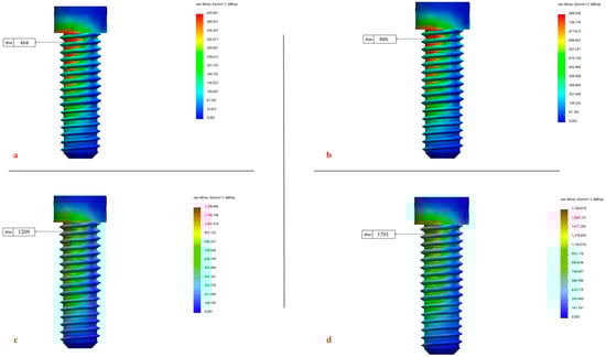 - Masticatory forces up to 550 N maintained the screw’s integrity for over 1.35 × 107 cycles, equivalent to 15 years of implant life. Higher loads (≥800 N) approached or exceeded the Ti-6Al-4V alloy’s yield strength, indicating reduced service life.