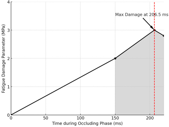 - At 300 N: The lowest fatigue damage parameter was observed, remaining below 1 MPa throughout the occluding phase. This level of force was well within the screw’s capacity to endure extended service life, likely exceeding the 15-year benchmark typically expected in dental applications.