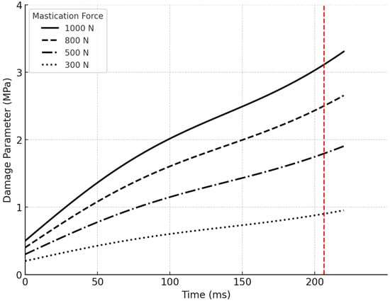 3.2. Fatigue Damage Analysis During the Chewing Cycle