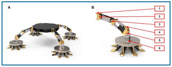 The robotic simulation platform. (A) Schematic diagram of the robot; (B) Structure of the robot leg: 1—shoulder yaw joint, 2—shoulder pitch joints, 3—elbow joint, 4—wrist pitch joints, 5—wrist yaw joints, 6—SCRBP.
