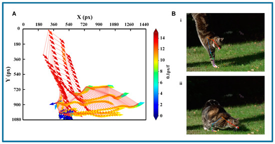 The result of the cat’s landing process. (A) The variations in position and velocity in the video clip using SLEAP; (B) Two critical frames during contact with the ground: i—the frame as the cat makes contact with the ground; ii—the frame as the cat begins to recover its posture after the landing process.