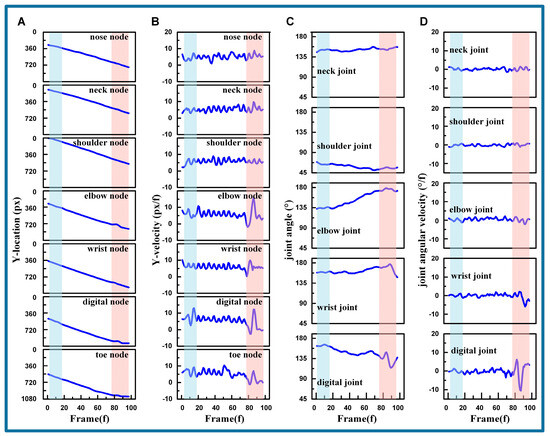 The vertical velocities of each node shown in Figure 5B reveal that the nose node, neck node, digital node, and toe node stabilize after reaching their peak locations, with fluctuation ranges of , , , , , , and . Similar to the locations in Figure 5A, the velocities of the shoulder node, elbow node, and wrist node fluctuate after reaching their peak positions before stabilizing.