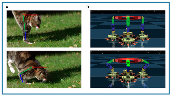 Simulation of the cat’s cushioning strategy on the robot platform. (A) The two key frames during the cat’s landing. (B) The two corresponding postures of the robot.