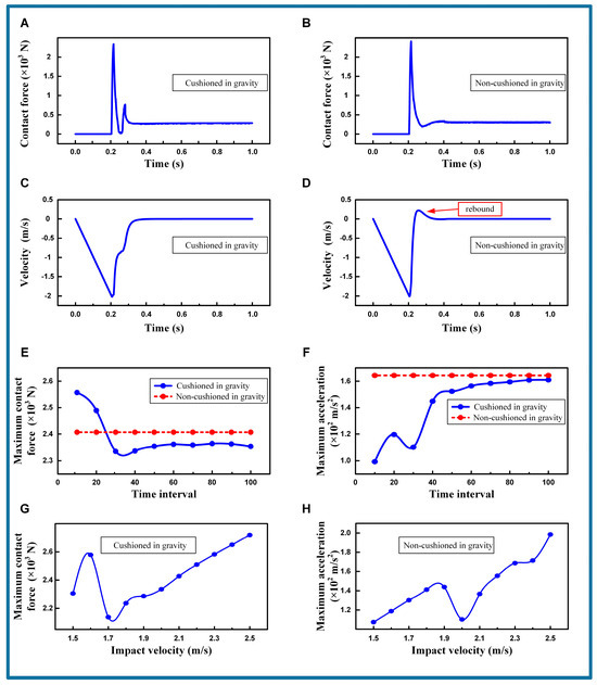 The cushioning characteristic under gravity. (A) Contact force is cushioned in gravity. Contact velocity = 2.0 m/s. Time interval = 30. (B) Contact force is non-cushioned in gravity. Contact velocity = 2.0 m/s. Time interval = 30. (C) Velocity is cushioned in gravity. Contact velocity = 2.0 m/s. Time interval = 30. (D) Velocity is non-cushioned in gravity. Contact velocity = 2.0 m/s. Time interval = 30. (E) Maximum contact force comparison with time interval. The red dashed line is the non-cushioned situation. (F) Maximum acceleration comparison with time interval. The red dashed line is the non-cushioned situation. (G) Maximum contact force comparison with impact velocity. (H) Maximum acceleration comparison with impact velocity.