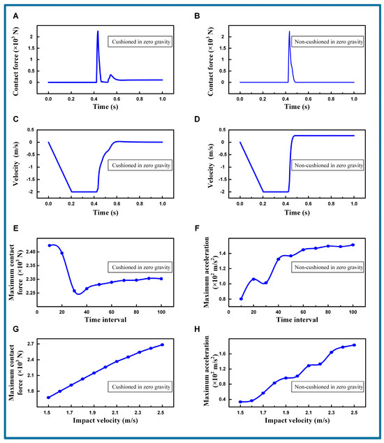 The cushioning characteristic under zero gravity. (A) Contact force with cushioned in zero gravity. Contact velocity = 2.0 m/s. Time interval = 30. (B) Contact force with non-cushioned in zero gravity. Contact velocity = 2.0 m/s. Time interval = 30. (C) Velocity with cushioned in zero gravity. Contact velocity = 2.0 m/s. Time interval = 30. (D) Velocity with non-cushioned in zero gravity. Contact velocity = 2.0 m/s. Time interval = 30. (E) Maximum contact force comparison with time interval. (F) Maximum acceleration comparison with time interval. (G) Maximum contact force comparison with impact velocity. (H) Maximum acceleration comparison with impact velocity.