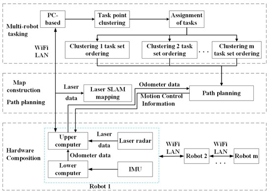 The process of multi-robot task allocation encompasses three primary stages: environment map generation, task assignment, and path planning. The SLAM (Simultaneous Localization and Mapping) method is employed to gather sensor data, which is then used to construct the map, group the system-issued task points into clusters, and efficiently distribute these clusters among the multi-robot system. Subsequently, each clustered task set undergoes sorting, and ultimately, multi-robot task allocation is achieved through the implementation of path planning. The systematic framework for multi-robot task allocation is illustrated in Figure 1.