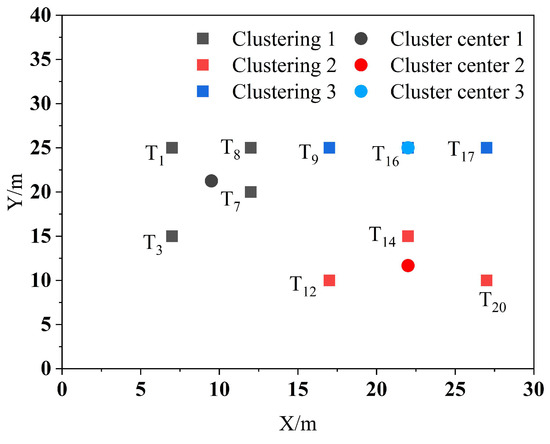 Let the system assign 10 tasks, T1, T3, T7, T8, T9, T12, T14, T16, T17, and T20, and have 3 robots carry these 10 tasks to the shelves and then return to their respective initial positions. Each robot has the capability to carry out a maximum of 6 handling tasks simultaneously. The K-means++ algorithm is applied to cluster the 10 task points, with a restriction on the maximum number of clusters set at 6. The clustering results are shown in Figure 5.