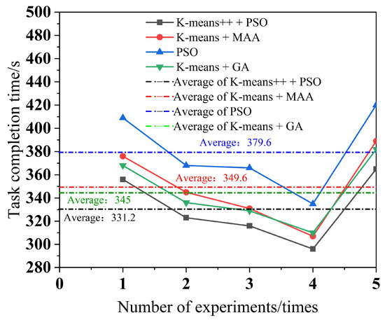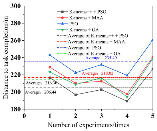 As can be seen from Figure 9, the K-means++ + PSO algorithm limits the maximum number of tasks in the clusters according to the carrying capacity of the robots, so the task allocation in Figure 9b is more reasonable, and the three robots can carry their respective assigned tasks at one time. From Figure 9d,h, it can be seen that in the K-means + MAA algorithm and K-means + GA algorithm, because the maximum number of tasks in the clusters has not been limited, Robot3 has been assigned seven tasks and eight tasks, so Robot3 cannot carry its tasks to the shelves at one time and needs to carry them twice. From Figure 9f, Robot2 using the PSO algorithm also needs to carry tasks twice to complete the carrying task, which increases the energy consumption and time cost of the robots. From Figure 10, it can be seen that the K-means++ + PSO algorithm shortens the task allocation time by 68.05% compared to the PSO algorithm, 49.84% compared to the K-means + MAA algorithm, and 33.68% compared to the K-means + GA algorithm. From Figure 11, it can be seen that the K-means++ + PSO algorithm reduces the time consumed to complete tasks by 5.26% compared to the K-means + MAA algorithm, by 4.0% compared to the K-means + GA algorithm, and by 12.75% compared to the PSO algorithm. Figure 12 shows that the K-means++ + PSO algorithm shortens the total distance traveled to complete the assigned tasks by 5.31% compared with the K-means + MAA algorithm, by 4.58% compared with the K-means + GA algorithm, and by 12.30% compared with the PSO algorithm. The algorithm proposed in this paper effectively improves the efficiency of the task assignment of multiple robots in the intelligent workshop.