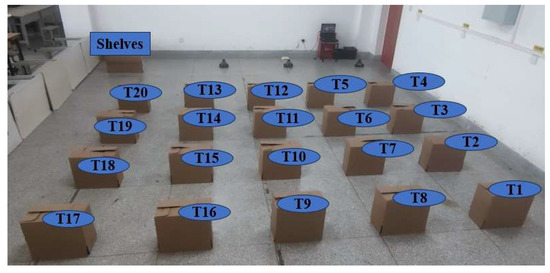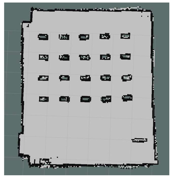The Gmapping algorithm is employed to construct SLAM maps of the experimental environment, as illustrated in Figure 15. The Gmapping algorithm is based on a particle filter, a probabilistic filter utilizing Monte Carlo methods. It estimates the robot’s state by maintaining a set of particles, each representing a possible position of the robot and the corresponding map feature. During the robot’s movements, the Gmapping algorithm updates the weights of the particles based on the environmental information scanned by the LiDAR and the robot’s movements, thereby enabling the estimation of the robot’s position and the construction of the map [24]. The coordinate positions of 20 task points and a shelf are recorded according to the odometer information during the map building process. The shelf position (in meters) is (−0.3, 6) and the coordinate position details for the 20 task points are presented in Table 3.