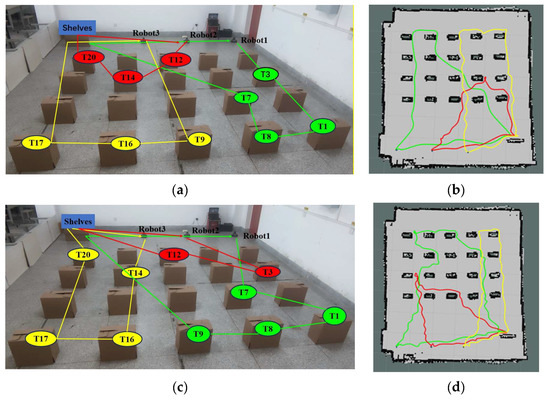 The experimental outcomes for the multi-robot task allocation using the algorithm introduced in this paper are displayed in Figure 16. In Figure 16a three robots go to execute their first tasks: robot 1 goes to execute task T3, robot 2 goes to execute task T12, and robot 3 goes to execute task T9. Figure 16b shows that robot 2 goes to execute task T14 after executing task T12. According to Figure 16c, Robot 2 proceeds to perform task T20 following the completion of task T14, while Robot 1 moves on to perform task T1 after completing task T3. Figure 16d indicates that robot 2 proceeds towards the shelf upon completing task T20, robot 1 transitions to task T8 following the completion of T1, and robot 3 undertakes task T16 after finishing T9. Figure 16e shows that robot 2 moves from the shelf position to the initial position after performing all handling tasks; robot 1 moves to the shelf position after performing task T7, and robot 3 moves to the shelf position after performing task T17. Figure 16f demonstrates that the three robots revert to their original positions once they complete their individual tasks.