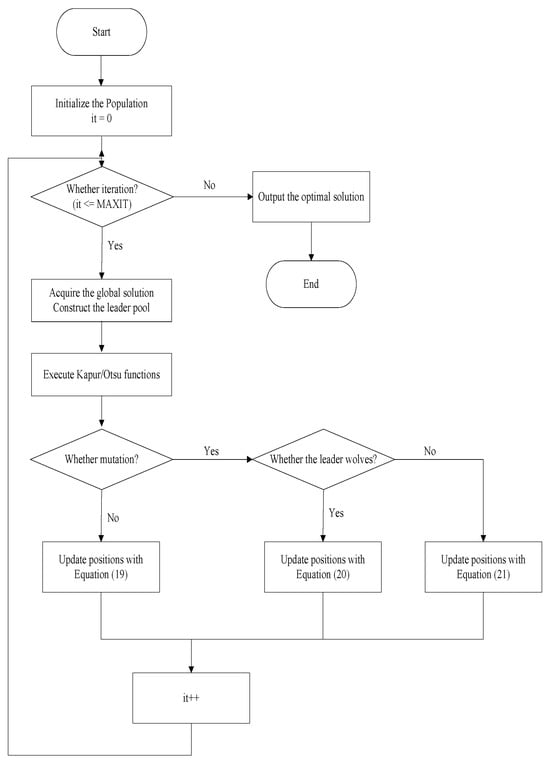To overcome these limitations, meta-heuristic methods [,], such as particle swarm optimization (PSO) [,], the salp swarm algorithm (SSA) [], and the multi-verse optimizer (MVO) [], have been applied to the field of image segmentation, and they have shown excellent performance. However, they often encounter the problem of local optimality [,]. We utilize the gray wolf optimizer (GWO) [] for color image segmentation.