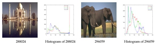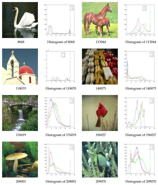 Ten images are randomly selected from the BSD500 benchmark [] to evaluate segmentation performance, and we use two, three, four, and five threshold levels to maximize the objective functions for each test color image. All test images and their corresponding histograms are shown in Figure 4. The performance of the proposed MGWO algorithm is compared with GWO [], MWOA [], and FOA []. The BSD500 benchmark dataset plays a crucial role in the objective evaluation of segmentation methods, as they provide standardized and reproducible results that can be compared among different algorithms. By testing these algorithms on BDSD500, we can ensure that the performance of the algorithms is evaluated under different conditions.