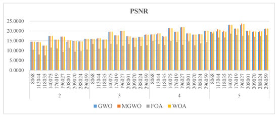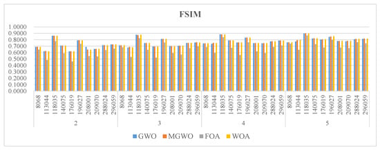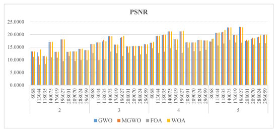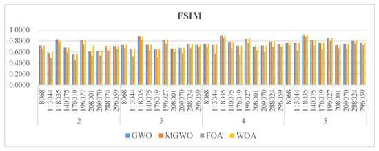 Figure 5, Figure 6 and Figure 7 present the PSNR, SSIM, and FSIM values for the segmentation results based on Kapur entropy. PSNR is a classic metric for measuring image quality. It calculates the difference between segmented and original images. A higher PSNR value indicates that the segmented image is more similar to the original one. GWO, MGWO, FOA, and MWOA perform well in multiple images, achieving high PSNR values in 7, 19, 0, and 17 images. In particular, MGWO exhibits exceptional performance in several test images, especially at threshold levels of 2, 3, and 4, where it outperforms the other comparison algorithms. The excellent performance of MGWO can be attributed to its global search capability during the optimization process, and it effectively finds the optimal balance among multiple thresholds. MGWO successfully preserves the details and clarity of the images during segmentation.