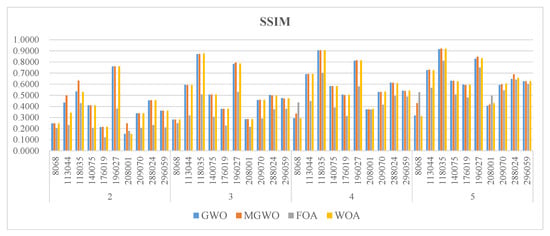 SSIM measures the structural similarity between images and takes into account brightness, contrast, and structure. A higher SSIM value, closer to 1, means that the segmented image has higher structural similarity to the original image. MGWO achieves optimal solutions in 15 images, accounting for 37.5% of all test cases. In comparison, MWOA and GWO are effective in 11 images. Consequently, MGWO demonstrates higher SSIM values in most images, showcasing its superior structural similarity.