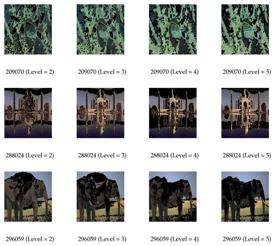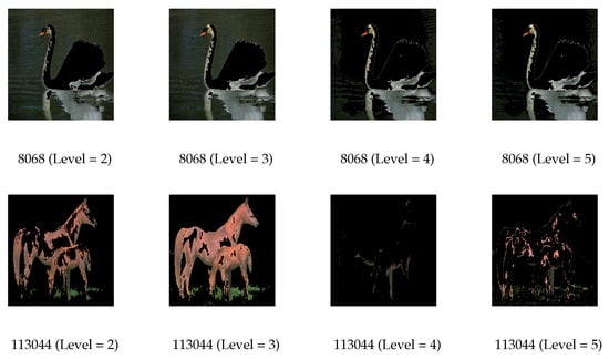 There are two methods to handle optimal thresholding problems: parametric and non-parametric methods [,]. For parametric methods, it is assumed that the gray levels of each class follow a probability density function, and then, the statistical parameters for each class are calculated. Traditional non-parametric methods tend to find optimal thresholds for dividing gray regions based on criteria such as Renyi entropy, cross-entropy, and interclass variance (Otsu method). Thresholding techniques are suitable when the number of thresholds is small. However, as the number of thresholds increases, multi-level color image thresholding has a higher computational cost and requires an exhaustive search to find the optimal values.