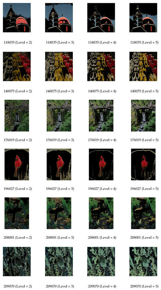 In digital media today, color images hold more significance than grayscale images. Segmentation techniques for color images have gained increasing attention due to various specific applications in image content analysis and image understanding [,]. Color images combine different color channels (usually red, green, and blue, known as RGB). Each pixel is composed of various intensities of these three colors, resulting in rich colors and details. Color image segmentation is a method that partitions an image into different regions with unique properties and characteristics. Common color image segmentation methods include feature-based methods, image domain-based methods, and physics-based methods [,]. In the first category, cluster segments are homogeneous regarding feature space (such as intensity level, color, or texture). After mapping the pixels to the color space, they are assigned to clusters according to their features. In general, feature space techniques are spatially blind and ignore pixel color spatial distribution. Histogram thresholding techniques can be classified into the second category. Thresholding techniques divide pixels based on their intensity or color levels, which are connected to global or multiple thresholds. The histogram consists of relatively separated intensity parts, and each represents an object in an image. The third category, in which segmentation is performed by dividing data into a defined number of clusters, includes K-means and Fuzzy C-means algorithms [].