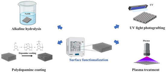 Surface functionalization involves coating 3D-printed scaffolds with various functional materials, including biologically active molecules such as growth factors, antibodies, peptides, nucleic acids, and their derivatives. This technique modifies the scaffold surface through chemical or physical treatments such as alkaline hydrolysis, ultraviolet photografting, and plasma treatment to enhance the scaffold’s biocompatibility. Various surface-functionalization methods are shown in Figure 1, while their principles, advantages, and disadvantages are listed in Table 3.