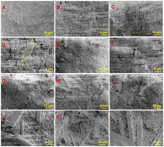 The microscopic morphologies of 0-HAW/HA, 1-HAW/HA, 2-HAW/HA, 3-HAW/HA, 4-HAW/HA, and 5-HAW/HA are presented in Figure 4. The surface of 0-HAW/HA was smooth and flat, and the spherical HA grains were tightly bonded. There were many irregular pores on the surface. As shown in Figure 4C,L, with increasing HAW content, the surface roughness of the HAW/HA scaffolds increased. When the HAW/HA ratio was 1:9 in the scaffold, a few strip-like HAWs appeared in the 1-HAW/HA scaffold, as shown in Figure 4C. More HA whiskers could be observed in the HAW/HA scaffolds with the increase in HAW content. When the HAW/HA ratio reached 4:6, it could be observed that HAWs were uniformly distributed in the HAW/HA scaffold, as shown in Figure 4I,J. HAWs filled the pores formed in the HA matrix and created a bridge effect in the scaffolds, which could have a positive impact on the mechanical properties of the scaffolds [43,44]. When the HAW/HA ratio was increased to 5:5, some HAW agglomeration could be observed with this HAW/HA ratio increment, which could be detrimental to the mechanical properties of the HAW/HA scaffolds [45].
