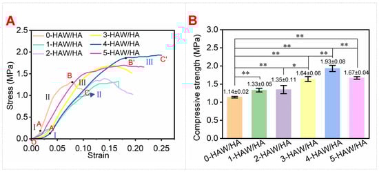 (A) Compressive stress–strain curve of HAW/HA scaffolds and (B) compressive strength of HAW/HA scaffolds with different HAW content. (* p < 0.05, ** p < 0.01).