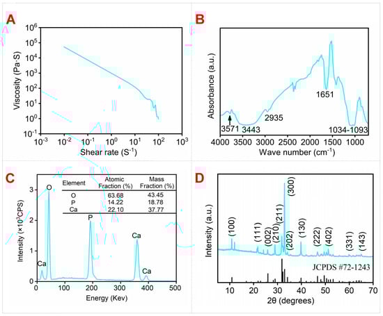 (A) Rheological property of 4-HAW/HA ink, (B) FTIR, (C) EDS, and (D) XRD pattern of 4-HAW/HA scaffold. Vertical lines represent HA standards according to JCPDS # 72-1243.