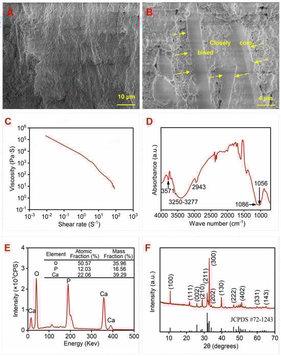 (A,B) SEM images, (C) rheological property, (D) FTIR, (E) EDS, and (F) XRD pattern of 4-HAW/HA-PVA scaffold. The yellow arrows represents the bonding location of PVA, HAWS and spherical HA. Vertical lines represent HA standards according to JCPDS # 72-1243.
