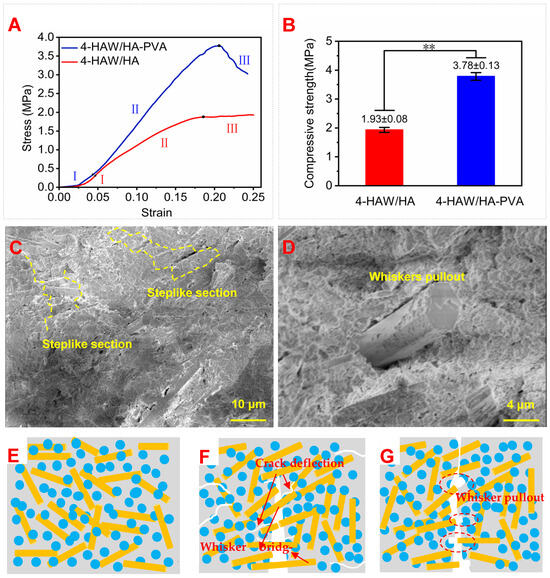 (A) Compressive stress–strain curves, (B) compressive strength of 4-HAW/HA and 4-HAW/HA-PVA scaffolds (** p < 0.01), (C,D) cross-sectional morphologies of 4 -HAW/HA-PVA, (E) the reinforcing toughing mechanism of PVA and hydroxyapatite bonding, (F) crack deflection and whisker bridging, and (G) whisker pullout. In the figure (E–G), the gray represents the 4 -HAW/HA-PVA matrix, the blue dot represents spherical HA, the yellow bars represents HA whisker.
