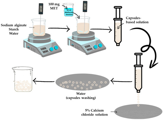 Flow diagram of the biopolymer-based capsule preparation process: The biopolymers and water are homogenized under stirring at 60 °C for 30 min. Subsequently, the MET solution is added, and the mixture is stirred for an additional 5 min. The resulting biopolymeric solution is then used for capsule formation.