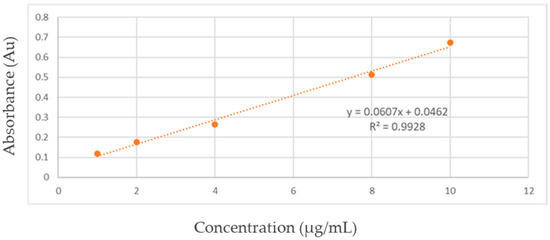 Calibration curve, encapsulation efficiency and in vitro drug release. A spectrophotometric method was used to evaluate the MET-containing capsules (A–C). For the calibration curve, 100 mg of MET was dissolved in a lab jar and made up to 100 mL with distilled water. From this stock solution, 1 mL was taken and diluted to 10 mL. Aliquots of 0.2, 0.4, 0.6, 0.8, and 1 mL were transferred to standard flasks and diluted with PBS to 10 mL. The final concentrations were 2, 4, 6, 8, and 10 µg/mL. The absorbance of the samples was measured at 233 nm, and the calibration curve was obtained (Figure 2).