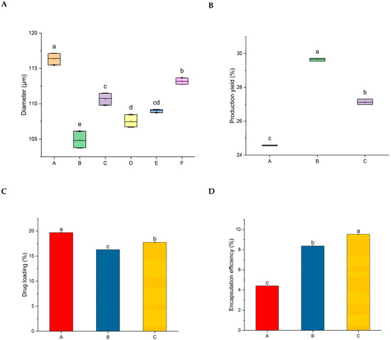 The diameter (A), production yield (B), drug loading (C), and encapsulation efficiency (D) of MET-containing capsules. A–E represent capsule formulations, according to Table 2. (A,B) Boxes represent the 25th–75th percentiles, with small squares indicating the mean ± SD. Values with differing letters are statistically different (p < 0.05). Bars are means ± SD.