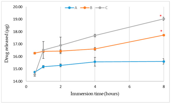 In vitro time-course profile of MET (100 mg) release. (A, 2500 mg sodium alginate, 500 mg starch); B, 2000 mg sodium alginate, 1000 mg starch; C, 1500 mg sodium alginate, 1500 mg starch). * indicates statistical difference compared to 0.5 h, p < 0.05.