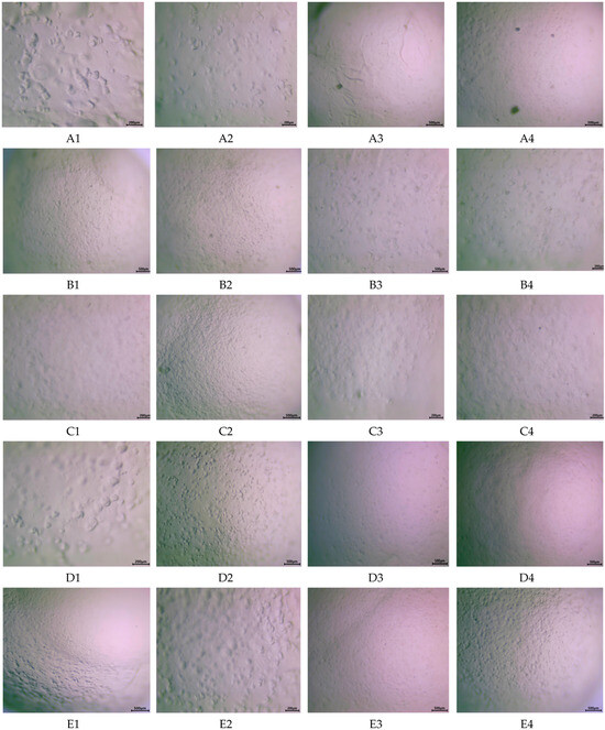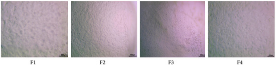 Microscopic images of capsules exposed to various gastric and intestinal conditions. (A–F) represents the sample composition and testing conditions: (1) fresh capsules; (2) 1 h in simulated gastric fluids; (3) 1 h in simulated intestinal media; (4) 1 h in simulated gastric fluids and 1 h in simulated gastric media.