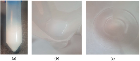 Behavior of the conventionally coated capsule in simulated gastric fluids: (a) complete dissolution of the tablet after one hour of immersion, as confirmed by the filtration of the resulting suspension (b,c).