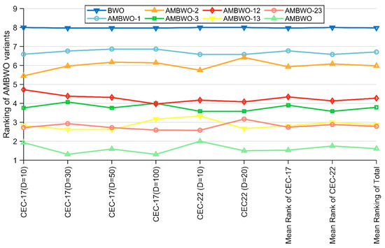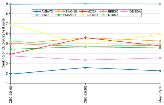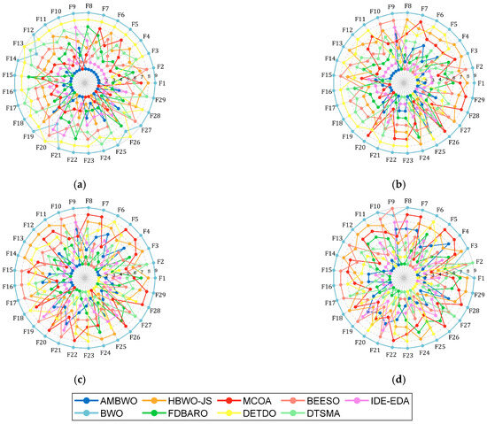First of all, Figure 3 shows a spider plot based on the ranking of each algorithm on each function to briefly demonstrate the performance of the AMBWO. We can tentatively conclude that the AMBWO has an excellent performance. The specific analysis is carried out below.