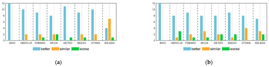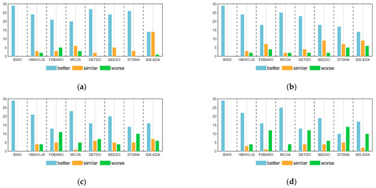 Table 6 shows the Wilcoxon test results of the AMBWO and the competitors for 10D, 30D, 50D, and 100D of the CEC2017 test functions. The symbols “+”, “−”, and “=” indicate that the AMBWO performed better than, worse than, and similar to the comparison algorithms, respectively. According to Table 6, the number of “+” symbols is more than the total number of “−” symbols, which indicates that the AMBWO outperformed the competing algorithms in different dimensions of the CEC2017. Figure 4 visualizes the Wilcoxon rank-sum test results for the AMBWO and the comparison algorithms.