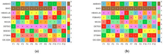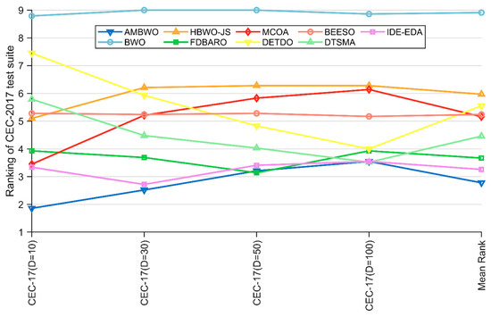 When D = 10, the AMBWO is better (worse) than the BWO, HBWO-JS, FDBARO, MCOA, DETDO, BEESO, DTSMA, and IDE-EDA in the 29(0), 24(2), 21(5), 20(3), 27(0), 24(5), 26(0), and 14(1) functions. Thus, the AMBWO is the best algorithm among these advanced methods in solving the 10D CEC2017 test function.