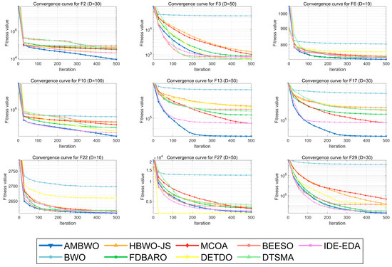 The convergence curves of AMBWO and other competitors based on CEC2017 (D = 100).