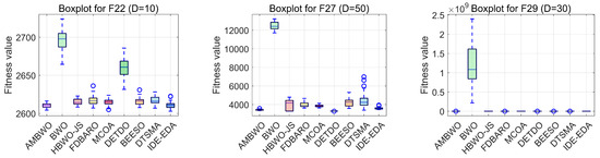 The boxplots of AMBWO and other competitors based on CEC2017 (D = 50).