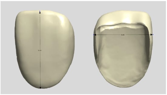 A typical model with a central maxillary incisor (D85DP-500B.1; Nissin Dental, Tokyo, Japan) was selected as the study model and prepared by a dentist in a butt joint incisal preparation design. The prepared abutment die was scanned using a dental scanner (E4, 3Shape A/S, Copenhagen, Denmark), and anatomically shaped zirconia laminates were designed as thin as 0.3 mm using CAD software (3Shape Dental Designer version 2023, 3Shape A/S, Copenhagen, Denmark) and saved as an STL file (Figure 1). The images were exported to the respective CAM software packages for printing and milling.