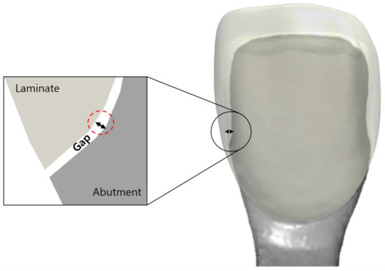 From a clinical perspective, the fit of a prosthesis is the gap between the inner and outer surfaces of the abutment tooth [36]. This is termed a fit or gap; the closer it is to zero, the higher the quality and suitability of the fit. As with all restorations, fit considerably impacts the longevity of the laminates [37]. A poor fit can lead to cement dissolution, causing decay and periodontal diseases as well as problems such as prosthesis fracture and dislodgement [38]. For laminates produced using the computer-aided design/computer-aided manufacturing (CAD/CAM) method, which is a subtractive method, any misfit at the laminate margin should be <120 µm [39]. Reportedly, when CAD/CAM is used, this restriction should not be >100 µm [40].
