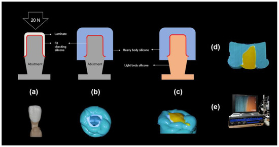 Process of the silicone replica method: (a): The abutment model filled with the fit-checking silicone and 20 N pressure, (b): Stabilization with the heavy body silicone, (c): Stabilization with the light body silicone, (d): Microscopic specimen, and (e) Digital microscope measurements.