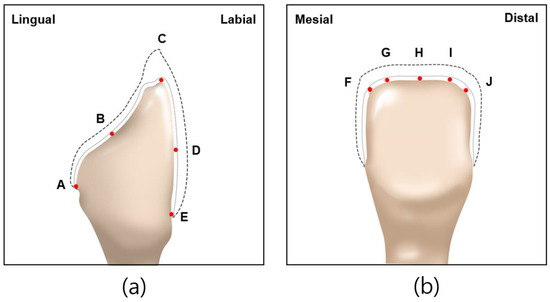 Ten measuring points selected on abutment in labiolingual and mesiodistal planes: (a) measuring points A, B, C, D, E of labiolingual plane; (b) measuring points F, G, H, I, J of mesiodistal plane.