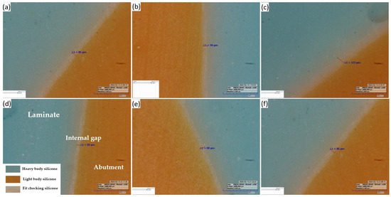 Representative image of the silicone replica method: (a,b,d,e) at labiolingual plane and (c,f) at mesiodistal plane (160× magnification).
