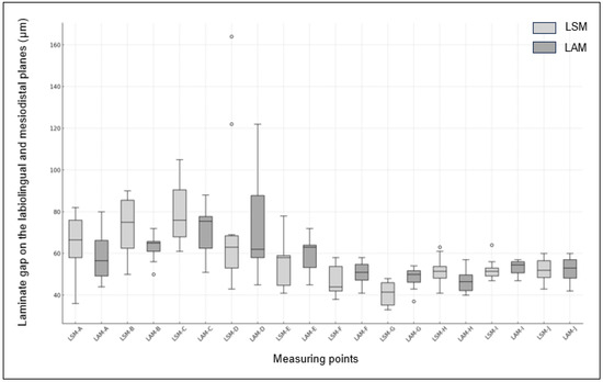 In the mesiodistal planes, a significant difference was observed between the two groups at measurement point G, which was adjacent to the mesial side (p = 0.004). However, no significant differences were observed at the measurement points F, H, I, and J. The widest gap was observed at measuring point I for the LAM group, measuring 53.50 μm, while the narrowest gap was at measuring point G for the LSM group, measuring 40.70 μm. Box plots of the LSM and LAM groups are shown in Figure 7.